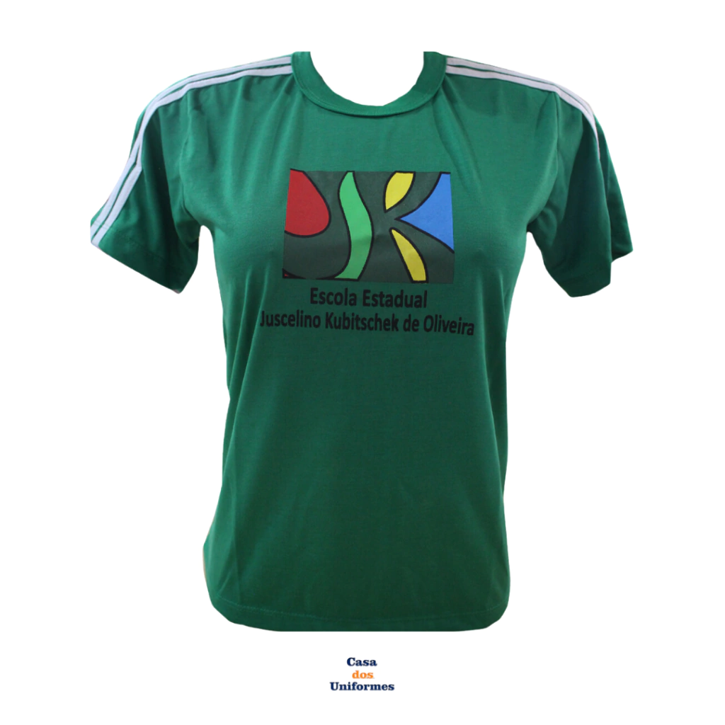 Camisa escolar em um material chamado PV, que é a abreviação da composição da malha: P de poliéster e V de viscose.