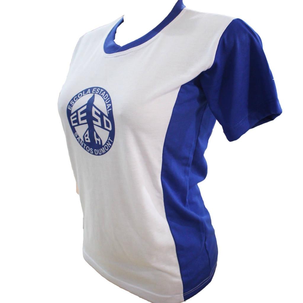 Camisa escolar em um material chamado PV, que é a abreviação da composição da malha: P de poliéster e V de viscose.